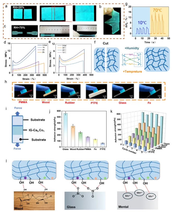 图6 (a、c)光学图像显示水诱导IG-Ca₅-Co₁加速划痕愈合过程及愈合后拉伸性能。(b)自重力条件下的愈合效率。(d)在70%相对湿度下修复不同时间的IG-Ca₅-Co₁拉伸应力-应变曲线。(e)在20%相对湿度下、不同温度下修复的IG-Ca₅-Co₁拉伸应力-应变曲线。(f)自愈合过程示意图。(g)IG-Ca₅-Co₁在10°C和70°C下的导电通路性能。(h)IG-Ca₅-Co₁粘附于不同基材的照片。(i)搭接剪切测试几何示意图。(j)IG-Ca₅-Co₁在不同基材上的粘附强度。(k)重复粘附测试。(l)粘附机理示意图。