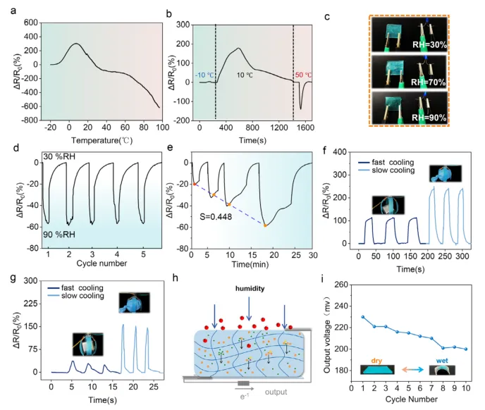 图7 (a)IG-Ca₅-Co₁的温度依赖行为。(b)IG-Ca₅-Co₁在不同温度下变形时的ΔR/R₀值。(c)不同相对湿度下LED亮度的数码照片。(d)在30%至90%相对湿度范围内,五个循环加湿-除湿循环的ΔR/R₀响应。(e)IG-Ca₅-Co₁的ΔR/R₀随相对湿度升高的演变。(f)不同热历史处理下,在90%相对湿度、10°C条件下对硬质和软质物体表面湿度的检测。(g)不同热历史处理下,在20%相对湿度、50°C条件下对硬质和软质物体表面温度的检测。注:所有操作均在恒温恒湿箱中进行,以排除环境温湿度干扰。被检测物体已在相应环境条件下适应一周。(h)IG-Ca₅-Co₁中湿气诱导发电的示意图。(i)IG-Ca₅-Co₁在十次测量循环中的水电信号散点图。
