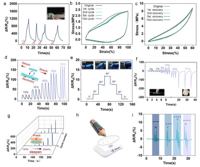 图8 (a)IG-Ca₅-Co₁暴露于火源热刺激下引发的电流变化。(b、c)IG-Ca₅-Co₁拉伸和压缩循环的应力-应变曲线。(d)三个循环内不同应变下的ΔR/R₀响应。(e)附着于手指关节的IG-Ca₅-Co₁在不同弯曲角度下的ΔR/R₀。(f)三个循环内不同冲击力下的ΔR/R₀响应信号。(g)IG-Ca₅-Co₁在10 kPa、20 kPa、50 kPa、100 kPa、200 kPa和500 kPa施加压力下的响应时间和ΔR/R₀变化,测量重复两次。(h、i)基于IG-Ca₅-Co₁的手写识别能力演示。