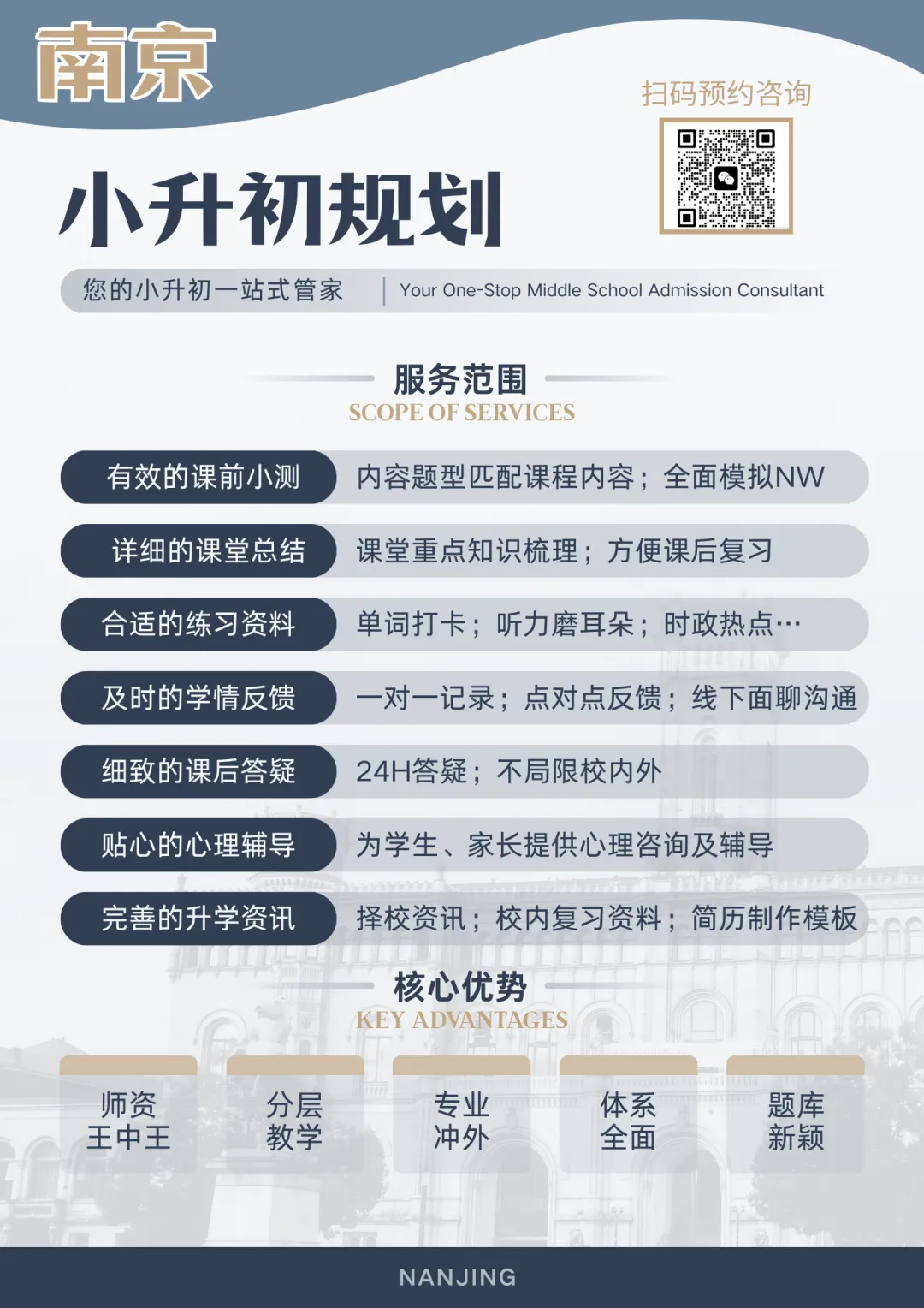 师资:师资力量呈现“精英化、多元化”特点,由鼓楼区公办名校交流教师及全国招聘名师组成