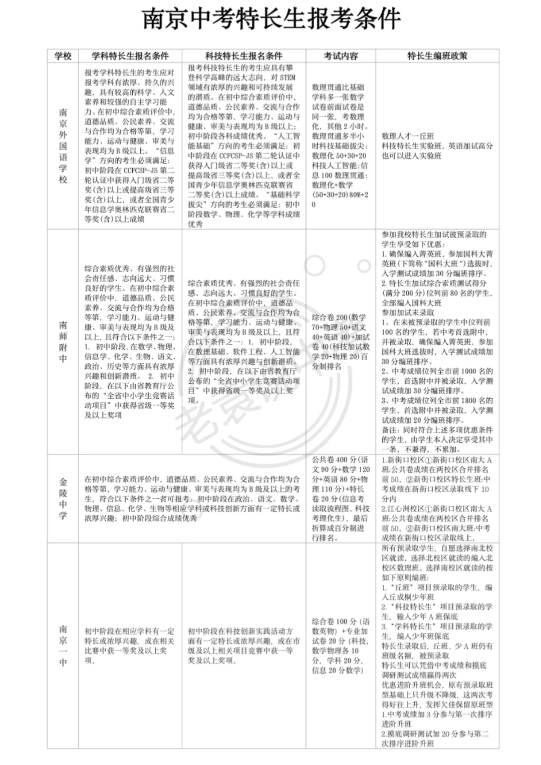 南京地区的特长生主要分为体育、艺术、科技、学科四大类,每类均需单独组织 专项考核,最终录取结果必须向社会公示,全程接受社会监督。