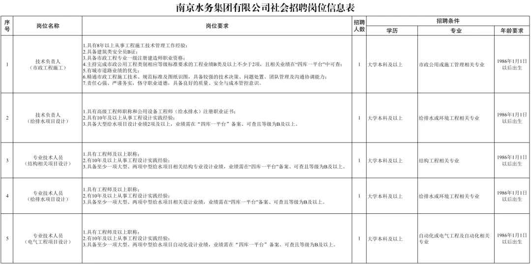 南京水务集团有限公司前身为南京市自来水总公司,始建于1929年,是南京主城地区主营供排水设施投资、建设、运营、管理一体化业务的市属国有大型企业。现因集团经营发展需要,公开招聘集团所属子企业优秀适岗人才5人。