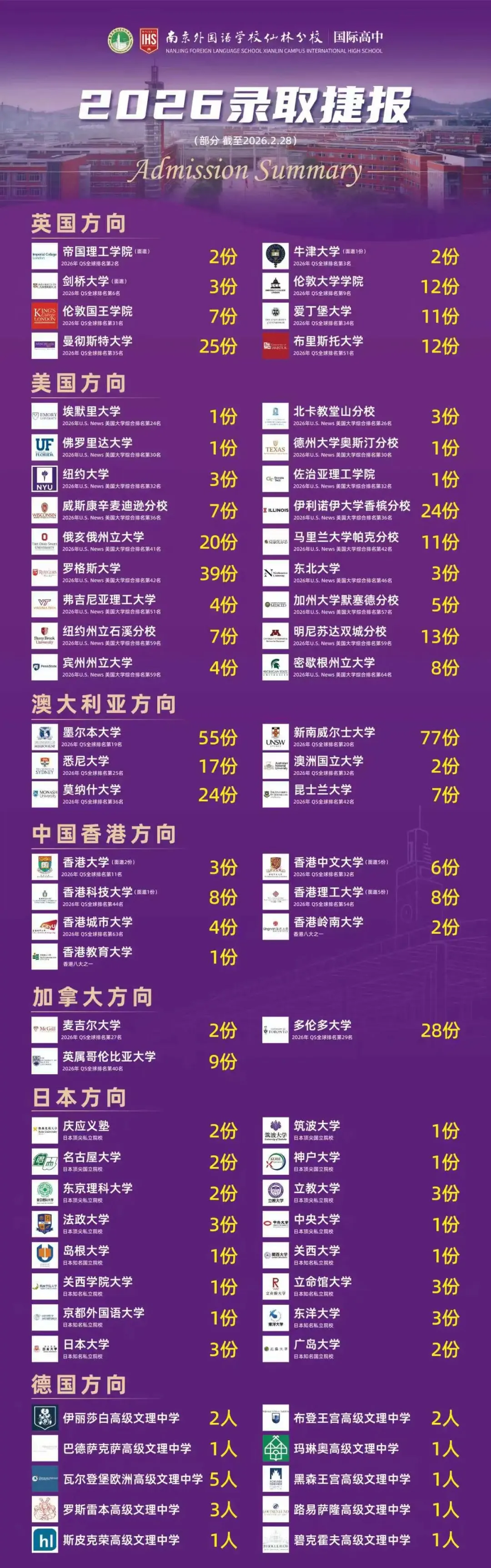 2005年经澳大利亚维多利亚州教育部批准,南外仙林分校正式开办VCE(维多利亚高中文凭)课程。2014年4月,凭借过去九年的澳洲课程办学成绩,经澳大利亚G-8(八大五星名校联盟)柱石成员单位新南威尔士大学(UNSW)学术委员会正式批准,澳大利亚国家教育部五星名校示范大学预科课程——优飞核心课程正式落户南京外国语学校仙林分校。从VCE课程到典范式澳洲大学精英课程的顺利升级见证了南外仙林分校用心打造中国第一澳洲品牌课程基地的卓越努力与华丽进化的过程。