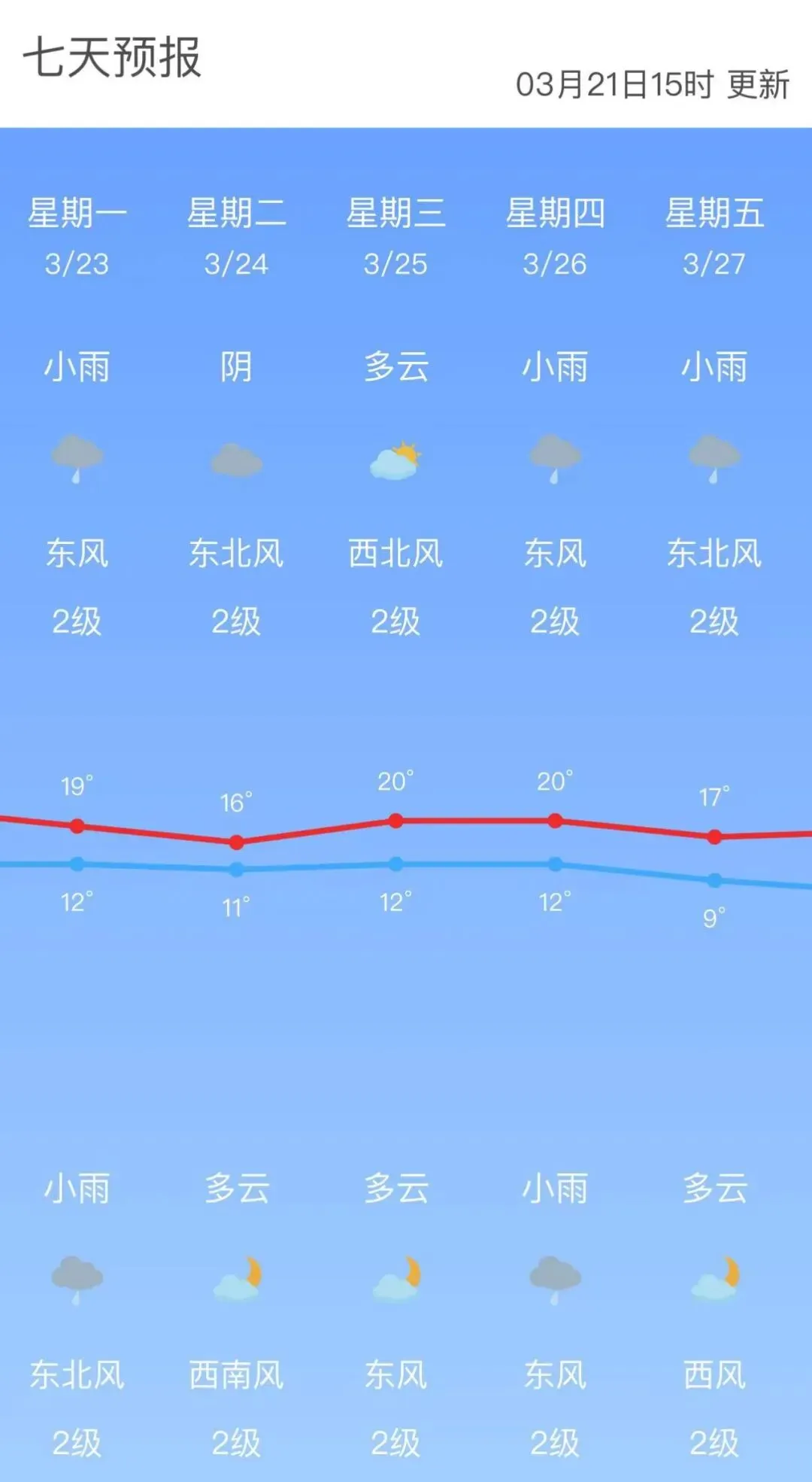 3月23日全市多云转阴有小雨