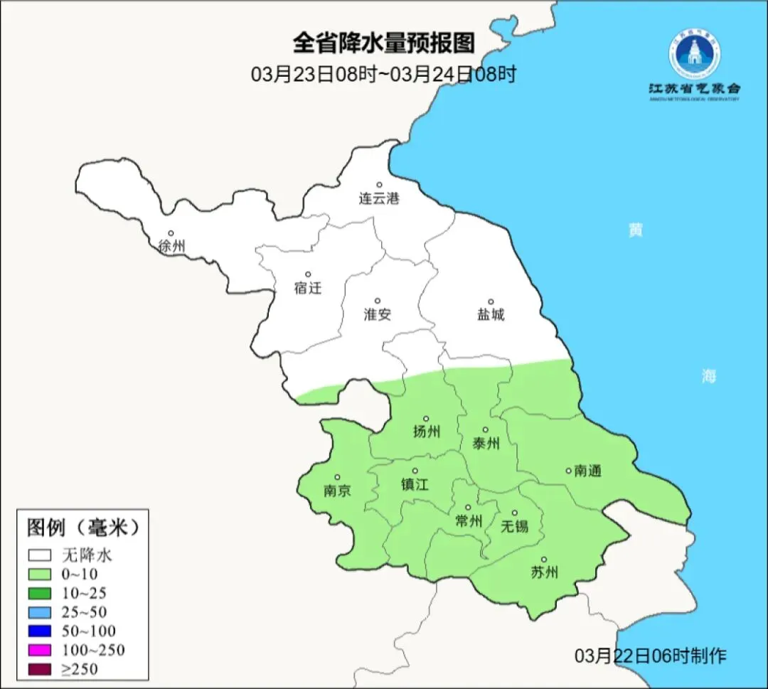 3月22日08时至3月23日08时,全省多云到晴。今天最高温度:全省18~19℃;明晨最低温度:长江以北东部地区6~7℃,苏南南部10℃左右,其他地区8~9℃。全省东南风转东北风,风力都是3-4级。