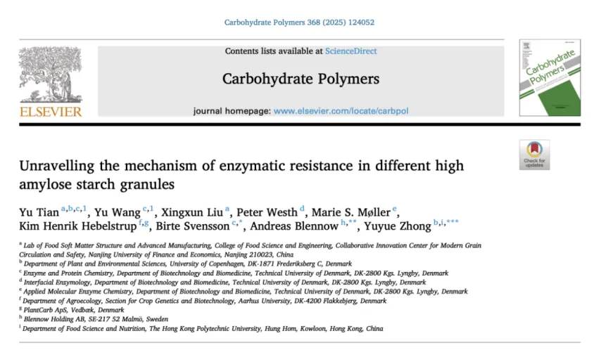 2025年11月15日,南京财经大学食品科学与工程学院田雨(第一作者),联合丹麦技术大学、哥本哈根大学、香港理工大学等多个国际团队,在国际TOP期刊Carbohydrate Polymers(Q1,IF: 12.5)发表题为“Unravelling the mechanism of enzymatic resistance in different high amylose starch granules”的研究性论文。
