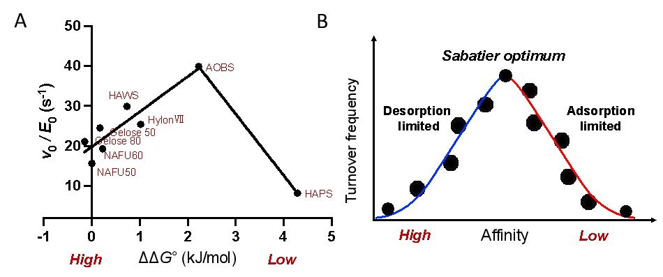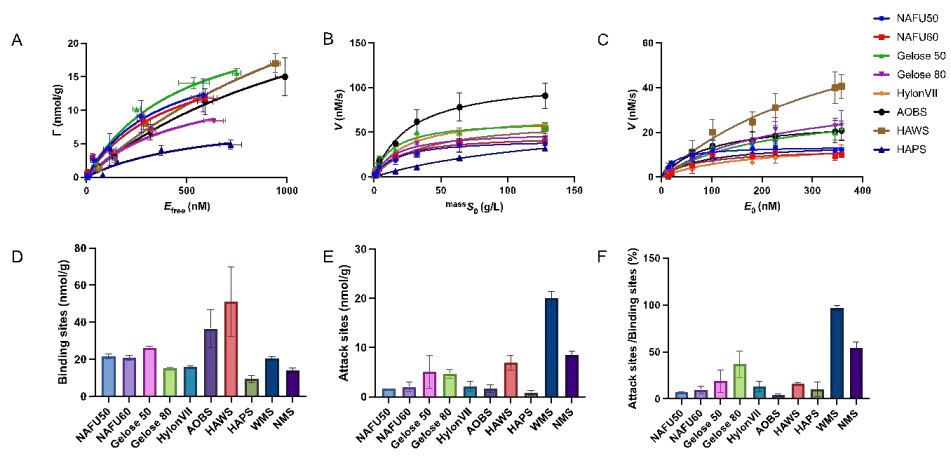 本研究选取来源于玉米、大麦、小麦和马铃薯的8种高直链淀粉,以葡萄糖淀粉酶(GA)为模型酶,创新性地应用界面酶动力学方法,系统解析了酶在淀粉颗粒界面的作用行为。通过定量表征酶的结合位点密度、催化位点密度、催化周转率及酶-底物亲和力,并结合FTIR-ATR、扫描电子显微镜(SEM)、共聚焦激光扫描显微镜(CLSM)及表面链长分布分析,建立了颗粒表面结构与界面催化动力学之间的关联。研究表明,高直链淀粉的酶解抗性主要来源于催化位点密度的降低,而非传统认知中的物理可及性限制。进一步分析发现,不同HAS之间抗性差异的本质在于酶-底物亲和力对催化周转率的调控作用。本研究首次将Sabatier原理引入淀粉颗粒界面催化体系,揭示酶活性与亲和力之间呈“火山型关系”:适中的酶-底物相互作用可实现最优催化效率,而过强或过弱的结合均会抑制反应进行。