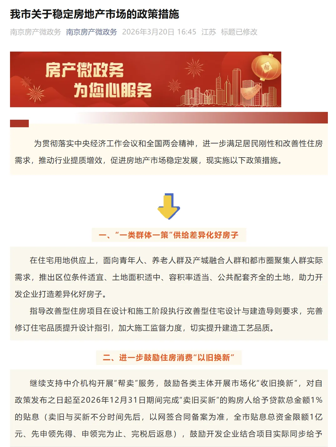 而就这周,3月20日 ,南京发布“宁六条”楼市新政,再次将南京楼市推向高潮,包括南京进一步鼓励住房消费“以旧换新”:即日起至2026年12月31日期间,购房人挂牌卖二手房、按揭买新房,就可享受贷款金额1%的贴息补助,全市限额1亿元,先申先得、完税后返息;