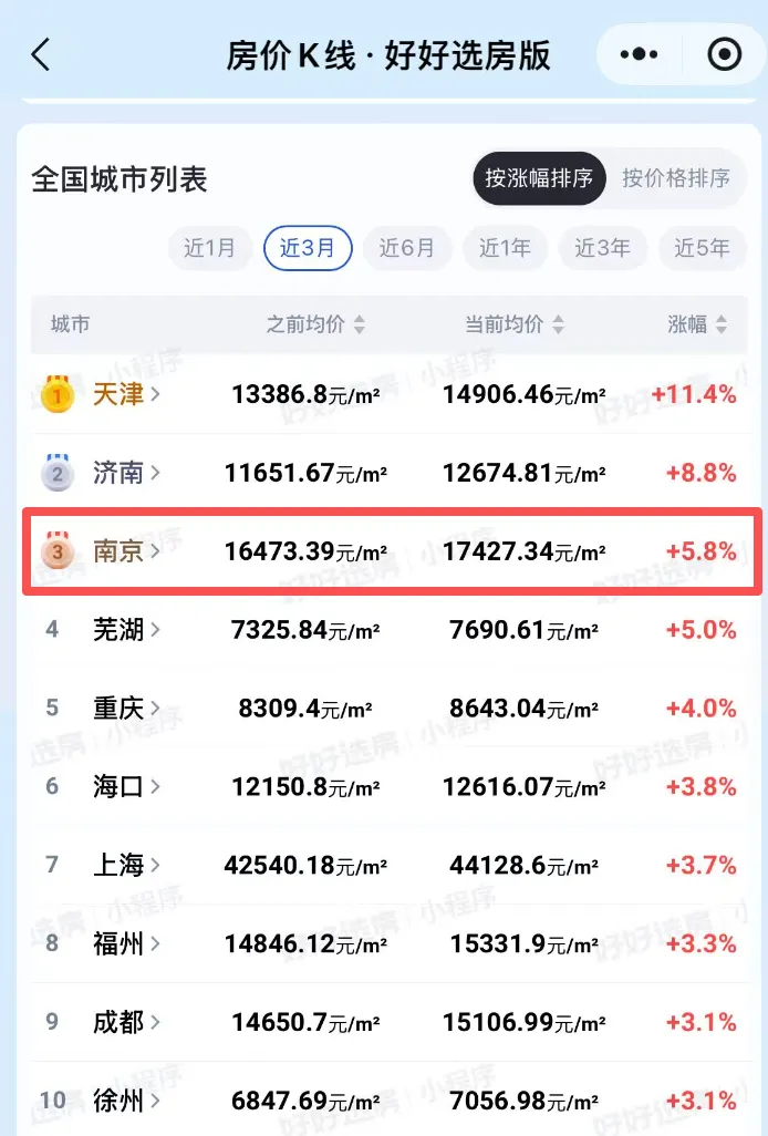 二手房层面,南京也是有明显回温,涨幅也是全国前三。
