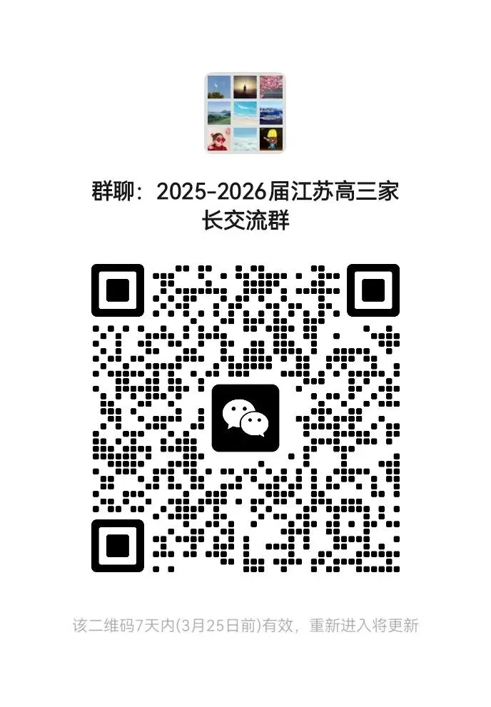 更多高考资讯可进“2025—2026届江苏高三家长群”了解,群内会第一时间发布江苏省最新高考信息,并有专业老师讲解,及时答疑解惑,有问必答,帮您理清各项政策细节,把握一切机会。非诚勿扰。
