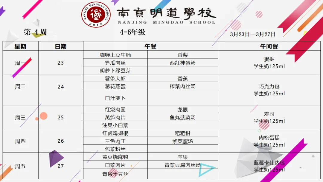 >南京明道学校第4周菜谱【4-6年级】20260323-20260327