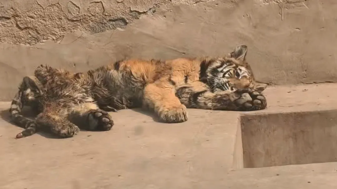 游客提供的视频显示,珍珠泉野生动物园里,一只小老虎慵懒地躺在墙角,看起来精神状况比较差。该小老虎体型偏瘦,下半身虎毛略脏,其他老虎从旁路过,会见其眨巴眨巴眼睛,但未见起身走动。