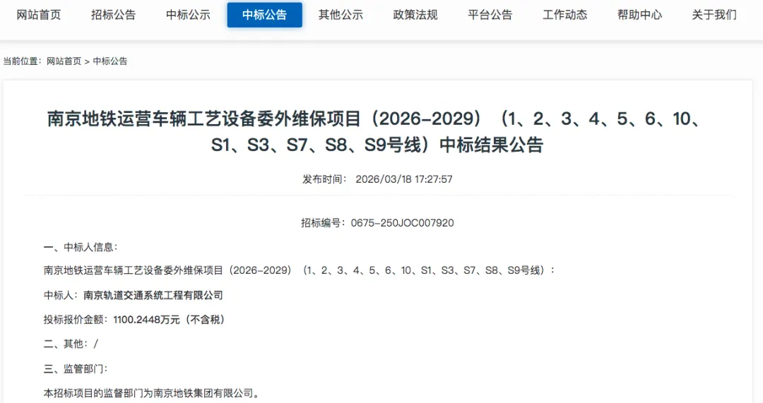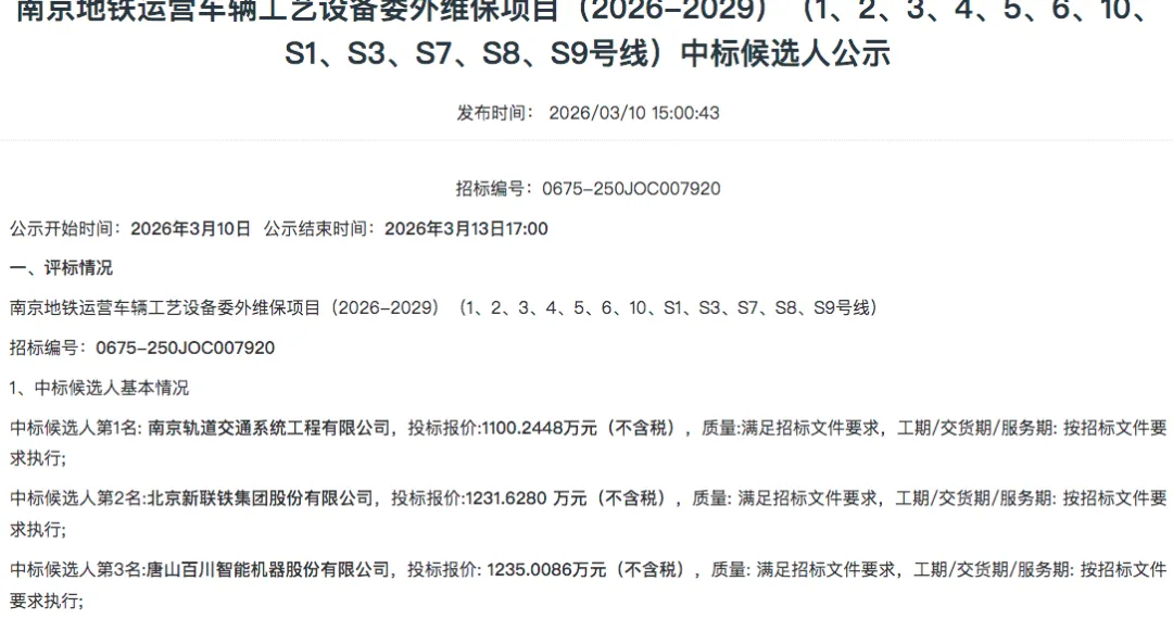 南京地铁运营车辆工艺设备委外维保项目(2026-2029)中标结果近日出炉。