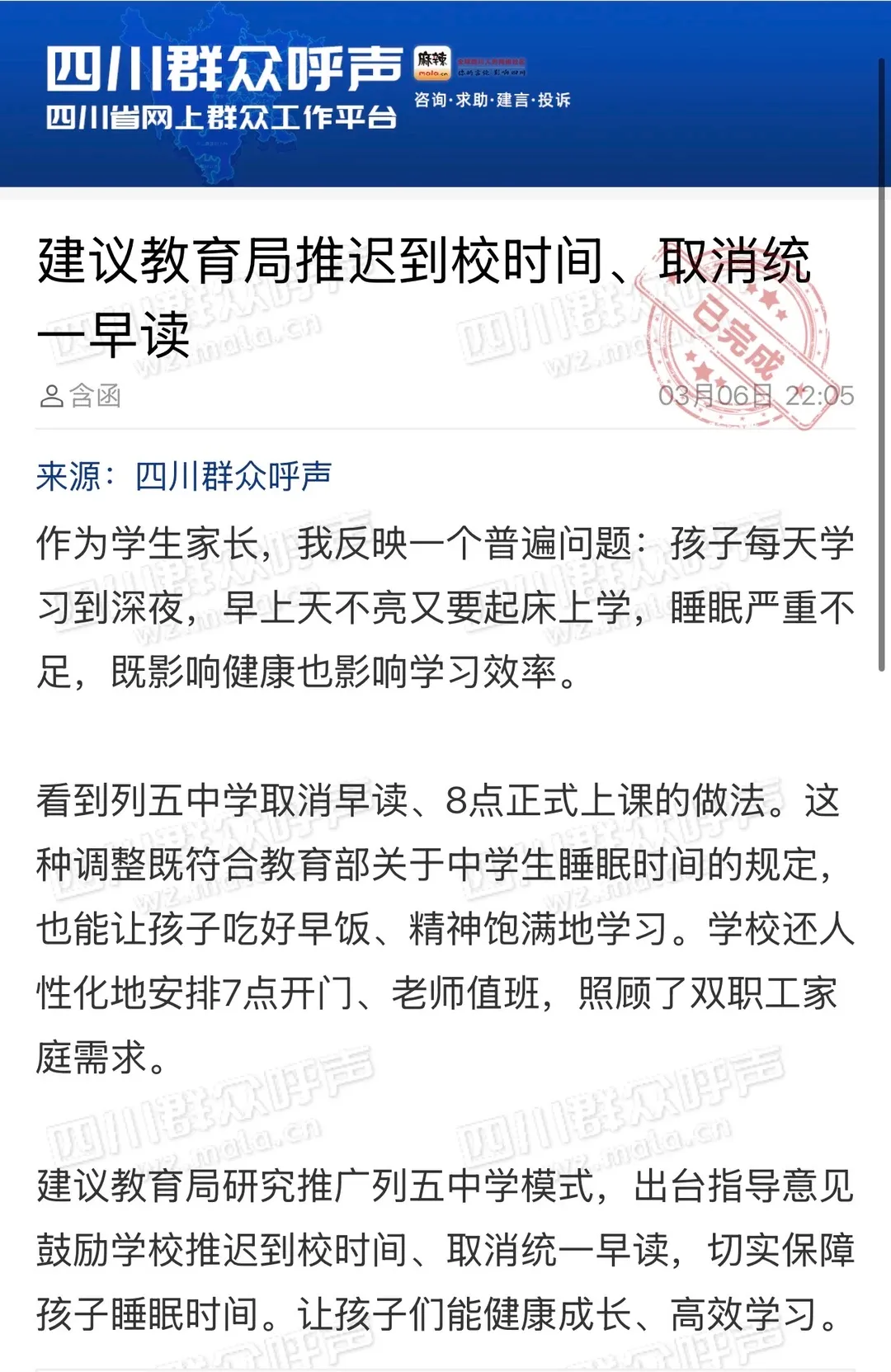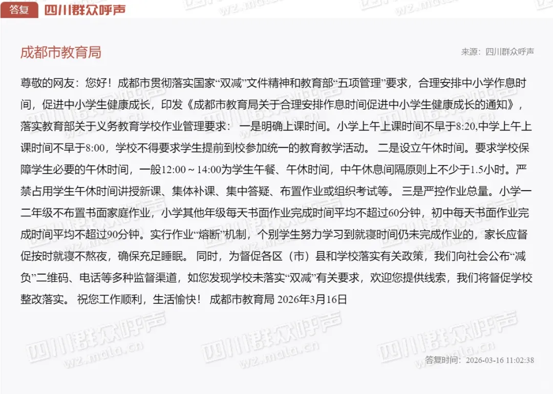 早前,树人有家长在班级群收到通知:期中复习,有班级作业量明显增加。年级部一再要求,严控作业量,确保孩子身心健康。也拜请家长做好配合:超过10:30(或家长认为合适的时间),孩子如果没有完成作业,立即停止学习,孩子休息。后续作业也不用再补,家长信息告知老师即可。实施“作业熔断机制”的初衷是为了保障孩子的身心健康。目前看,对于写作业效率高的孩子没什么影响;对于效率低的孩子,短期可以缓解家庭辅导作业的问题,长期影响还不好说。对于孩子写作业拖拉的问题,家长有时候也很无奈。近日,四川的网友也建议教育家推迟到校时间,取消统一早读,家长表示孩子每天学习到深夜,早上天不亮又要起床上学,睡眠严重不足,建议教育局研究推广列五中学模式,出台指导意见鼓励学校推迟到校时间、取消统一早读,切实保障孩子睡眠时间。让孩子们能健康成长、高效学习。成都市教育局回复:小学上午上课时间不早于8:20,中学上午上课时间不早于8:00,学校不得要求学生提前到校参加统一的教育教学活动。要求学校保障学生必要的午休时间,一般12:00~14:00为学生午餐、午休时间,中午休息间隔原则上不少于1.5小时。严禁占用学生午休时间讲授新课、集体补课、集中答疑、布置作业或组织考试等。三是严控作业总量。小学一二年级不布置书面家庭作业,小学其他年级每天书面作业完成时间平均不超过60分钟,初中每天书面作业完成时间平均不超过90分钟。实行作业“熔断”机制,个别学生努力学习到就寝时间仍未完成作业的,家长应督促按时就寝不熬夜,确保充足睡眠。关于“作业熔断”制,家长对此看法不一:
