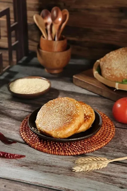这烧饼的灵魂在于鸭油——南京人连鸭油都不浪费,用高邮湖麻鸭油和面,经九层酥皮折叠,烤得外皮金黄酥脆,芝麻一咬直掉渣,内里却绵软如云。