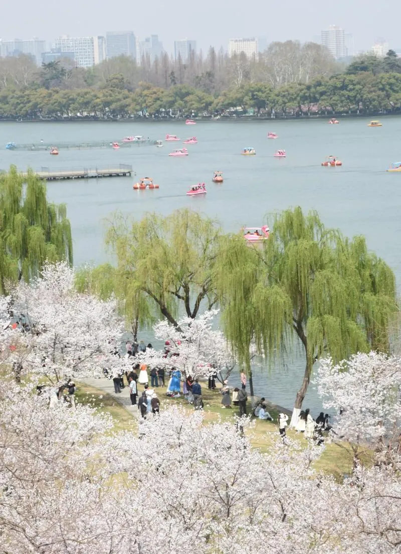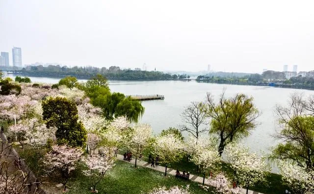 我们的第一站位于玄武湖的一角,但这绝非那个人声鼎沸的常规入口。从翠洲门悄悄潜入,你会发现这里藏着一片鲜为人知的樱花林,它们与垂柳交织在一起。这里的樱花树树龄普遍偏大,粗壮的枝干横卧在水面上,倒影出的粉色与湖水的湛蓝构成了绝佳的视觉对比。