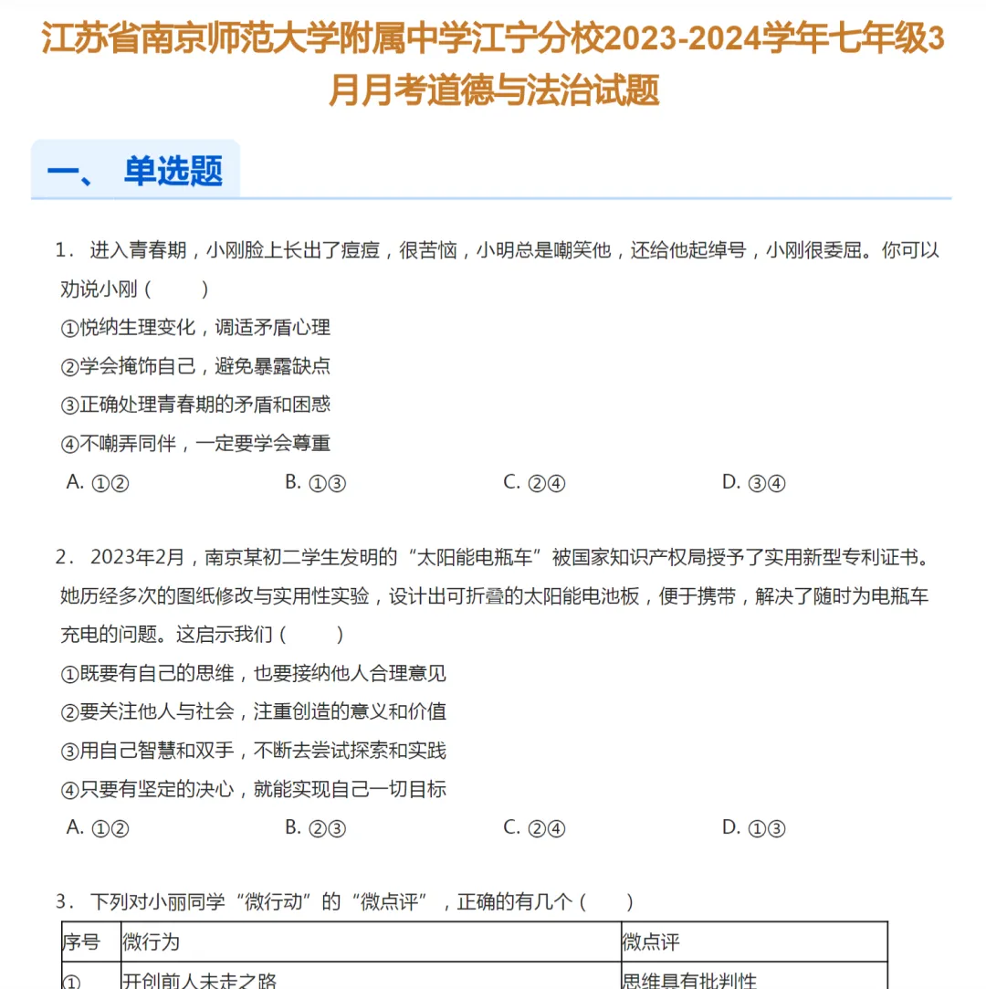 >2023-2024年南京市各区初一下学期月考政治试卷及答案解析