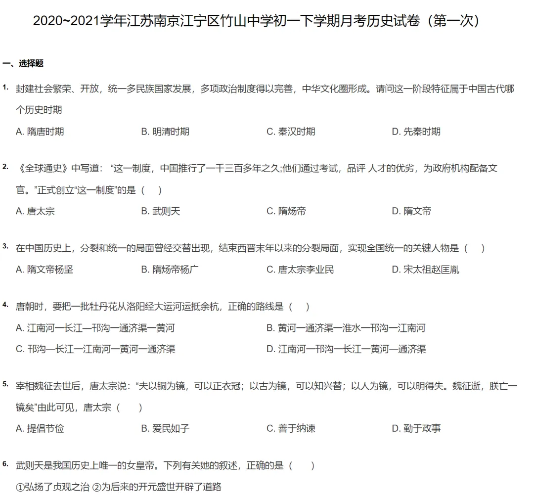 >2020-2021年南京市各区初一下学期月考历史试卷及答案解析