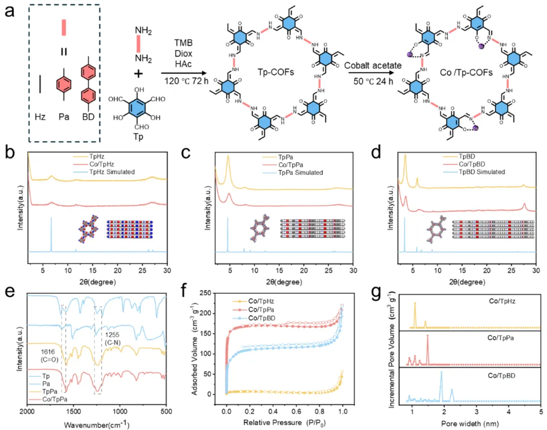 共价有机框架固定化钴单原子中次级配位球的调控用于类芬顿催化https://doi.org/10.1016/j.apcatb.2026.126516尽管单原子催化剂(SACs)中配位微环境的重要性已得到广泛认可,但对更扩展的配位球进行精确调控仍是一项重大挑战。本研究通过次级配位球(SCS)调控策略,制备了一系列钴基单原子催化剂(Co/TpHz、Co/TpPa、Co/TpBD)。该策略通过将孤立的钴位点锚定在三种具有不同框架共轭程度的β-酮烯胺连接的共价有机框架(COFs)中实现,这种共轭程度差异源于氨基苯基连接体中芳香环数量的可控变化。值得注意的是,单苯型Co/TpPa催化剂在基于过一硫酸盐(PMS)的类芬顿反应中表现出优异的双酚A去除性能,反应速率常数(k)高达0.54 min⁻¹,分别是Co/TpHz和Co/TpBD的2.6倍和49倍。密度泛函理论(DFT)计算表明,次级配位球的调控显著影响钴位点的电子结构。其中,Co/TpPa的活性位点对PMS表现出最强的吸附能(-1.60 eV)和最低的反应能垒。本研究为次级配位球在单原子催化剂中的作用提供了重要见解,并为高性能类芬顿催化剂的理性设计开辟了新途径。基于过一硫酸盐(PMS)的高级氧化工艺(AOPs)在环境修复领域展现出巨大潜力,这得益于其能够高效活化PMS生成高活性氧物种(如硫酸根自由基、羟基自由基和单线态氧等),从而实现有机污染物的有效降解。然而,传统均相催化体系存在金属离子溶出、pH适用范围窄及催化剂回收困难等问题。单原子催化剂(SACs)的出现为解决这些挑战提供了新范式,其最大化的原子利用率和均匀的活性位点有望实现PMS的高效选择性活化。其中,钴(Co)基单原子催化剂因其对PMS的本征高反应活性而备受关注。尽管如此,当前研究主要聚焦于优化金属中心的一级配位环境(如Co-N₄、Co-N₂O₂等),却忽视了周围化学微环境对催化性能的深远影响。因此,实现理论预测的活化效率仍具挑战,对反应机制的全面理解仍需进一步探索。