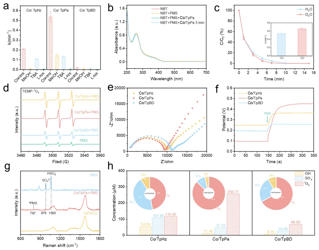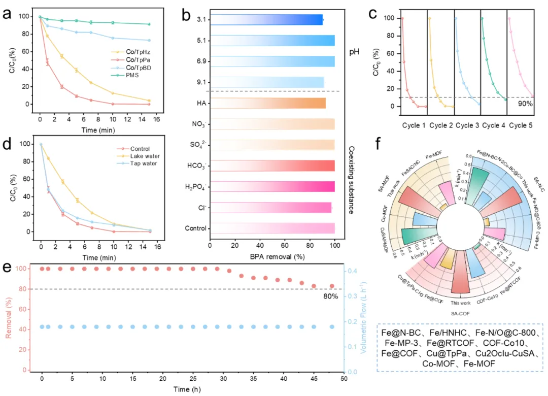 综上所述,本研究开发了一种次级配位球(SCS)调控策略,以实现对共价有机框架(COFs)电子结构的工程化设计,并定制钴单原子中心的配位微环境。实验与理论分析表明,增强的共轭效应引发的电子重排促进了电子从COFs骨架向钴中心的转移。这种电子调控使过一硫酸盐(PMS)的活化路径从以自由基为主导的过程转变为以单线态氧(¹O₂)驱动的非自由基机制为主,同时增强了PMS的吸附能力(吸附能=-1.60 eV)。优化后的Co/TpPa体系可在10分钟内完全降解双酚A(BPA),其反应速率常数显著优于同类催化剂,且在宽pH范围和复杂水基质中表现出优异的稳定性与抗干扰能力。本研究确立了次级配位球调控作为单原子催化剂电子尺度设计的典范,为水净化中污染物的高选择性降解提供了新策略。