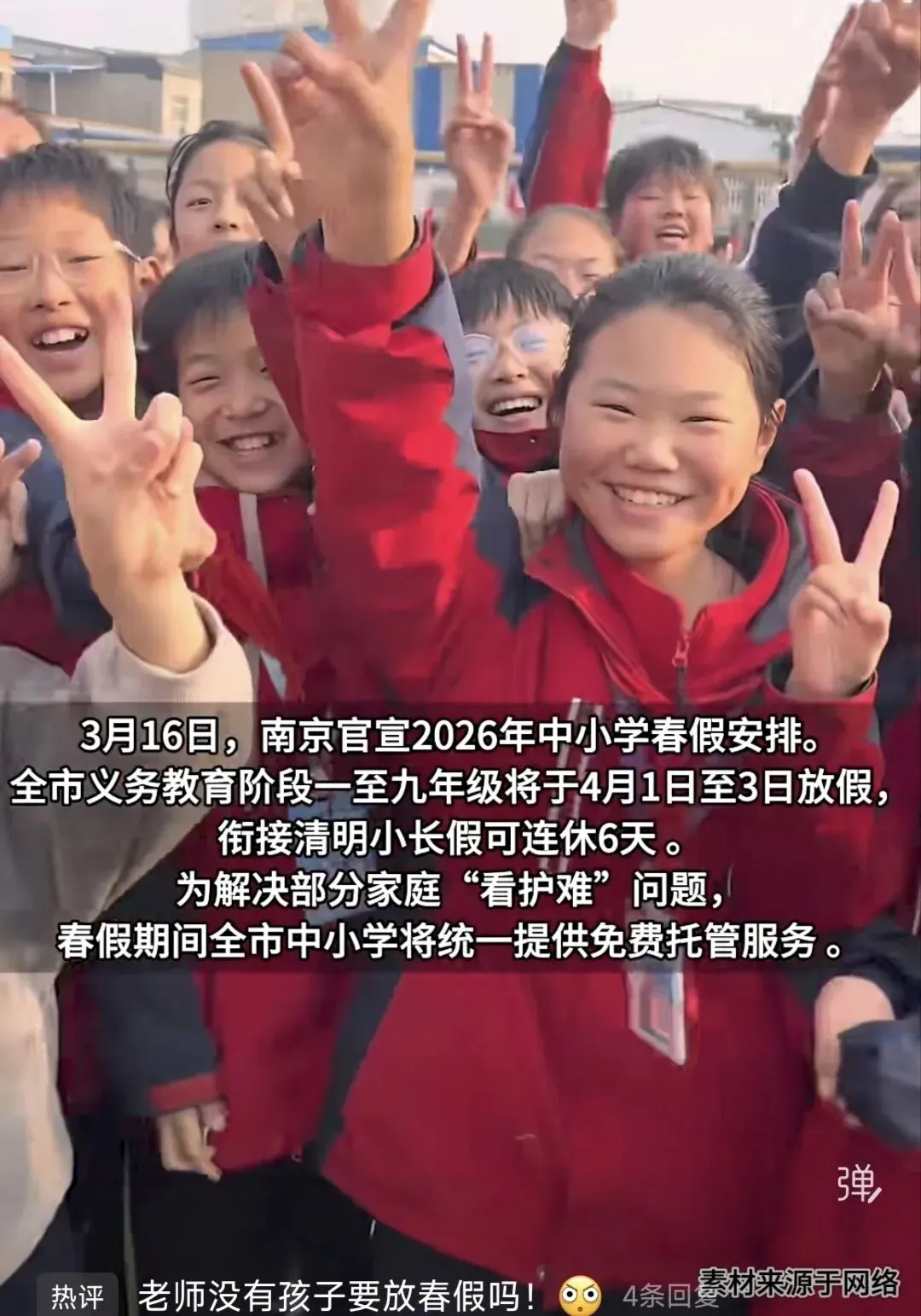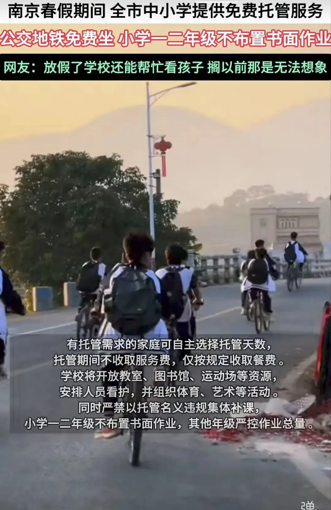 随后,南京市再下通知:春假期间全市中小学将统一提供免费托管服务,解决部分家庭“看护难”问题。