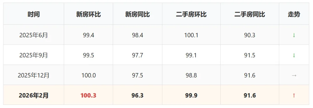 南京房价同比已连续多月负增长,但2025年11-12月新房环比止跌企稳,2026年2月回升至100.3,显示市场正在筑底。此时出台刺激政策,事半功倍。