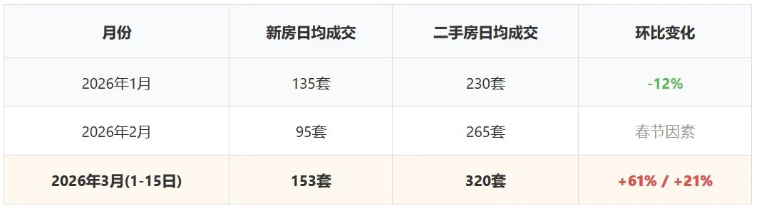 3月二手房日均成交已达320套,较2月春节后提升21%,显示改善型需求正在释放。挂牌量连续3个月下降6.2%(从13.8万套降至12.9万套),供需关系改善。