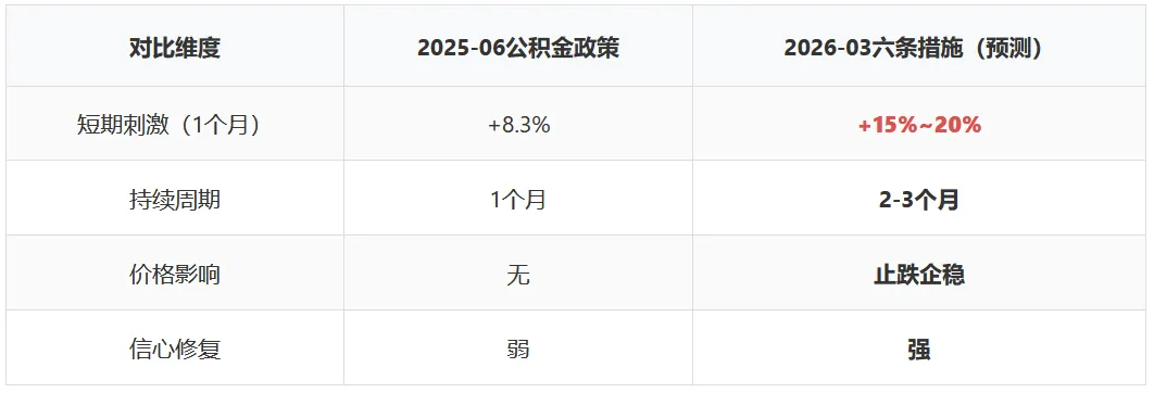 本次六条措施在财政投入直接性和工具组合完整性上均超越历史政策。1亿元贴息是近一年来首次直接财政让利,预计刺激效果将强于公积金政策。
