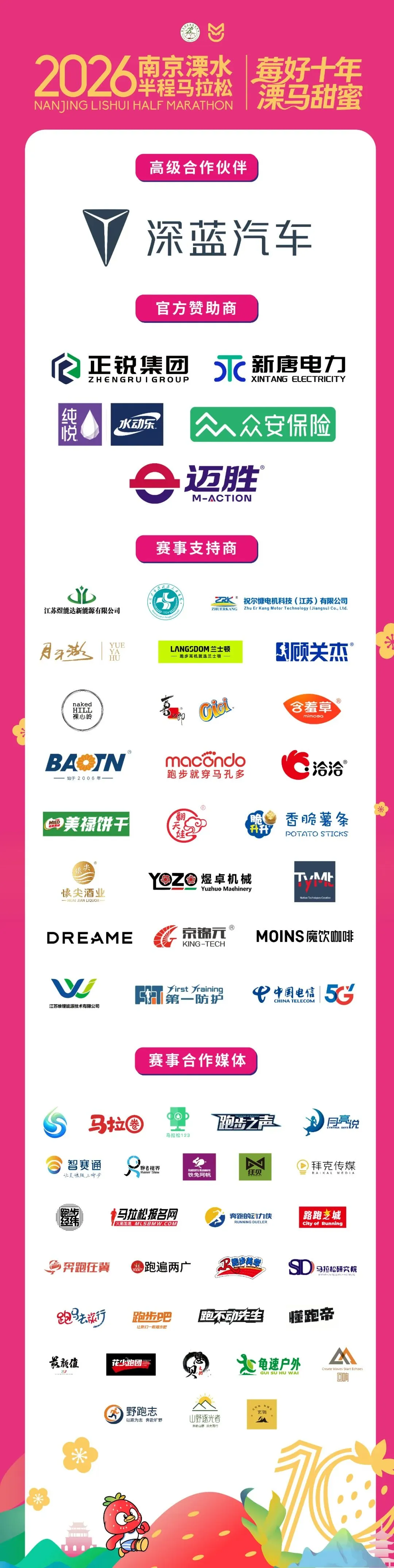 2026南京溧水半程马拉松的圆满举办,离不开众多企业的倾情助力与鼎力支持,各赞助企业从品牌赋能、物资补给、安全保障、装备支持等多方面全方位参与赛事,与溧马携手打造这场十年体育盛典,让赛事的专业度、体验感全面升级。
