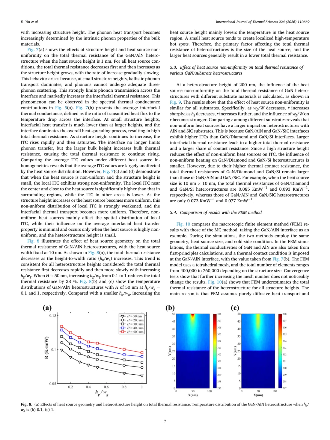 对比分析进一步表明,有限元方法在所有结构高度下都低估了异质结构的总热阻,主要原因是有限元方法假设纯扩散热传输,无法捕捉纳米尺度下的弹道声子输运,导致对体热传导和界面热传输的高估。此外,有限元方法计算显示热量均匀向外扩散,形成相对均匀的温度场,而蒙特卡洛计算则揭示了明显的局部热点,平均热源温度达307.0 K,远高于有限元方法预测的299.5 K。这些结果表明,当存在纳米尺度热源或结构时,传统的宏观有限元方法显著低估了总热阻,不适用于此类场景。