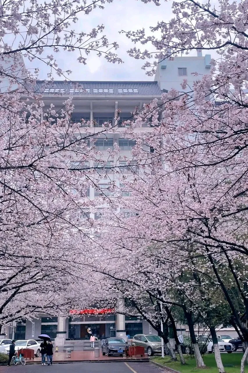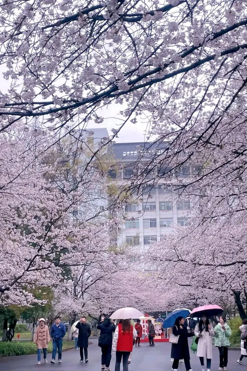 南京林业大学樱花季 从学校大门直走绕过球星建筑就可以看见一条两百米的樱花大道 飘落的花瓣搭配洒落的阳光 真是绝美。