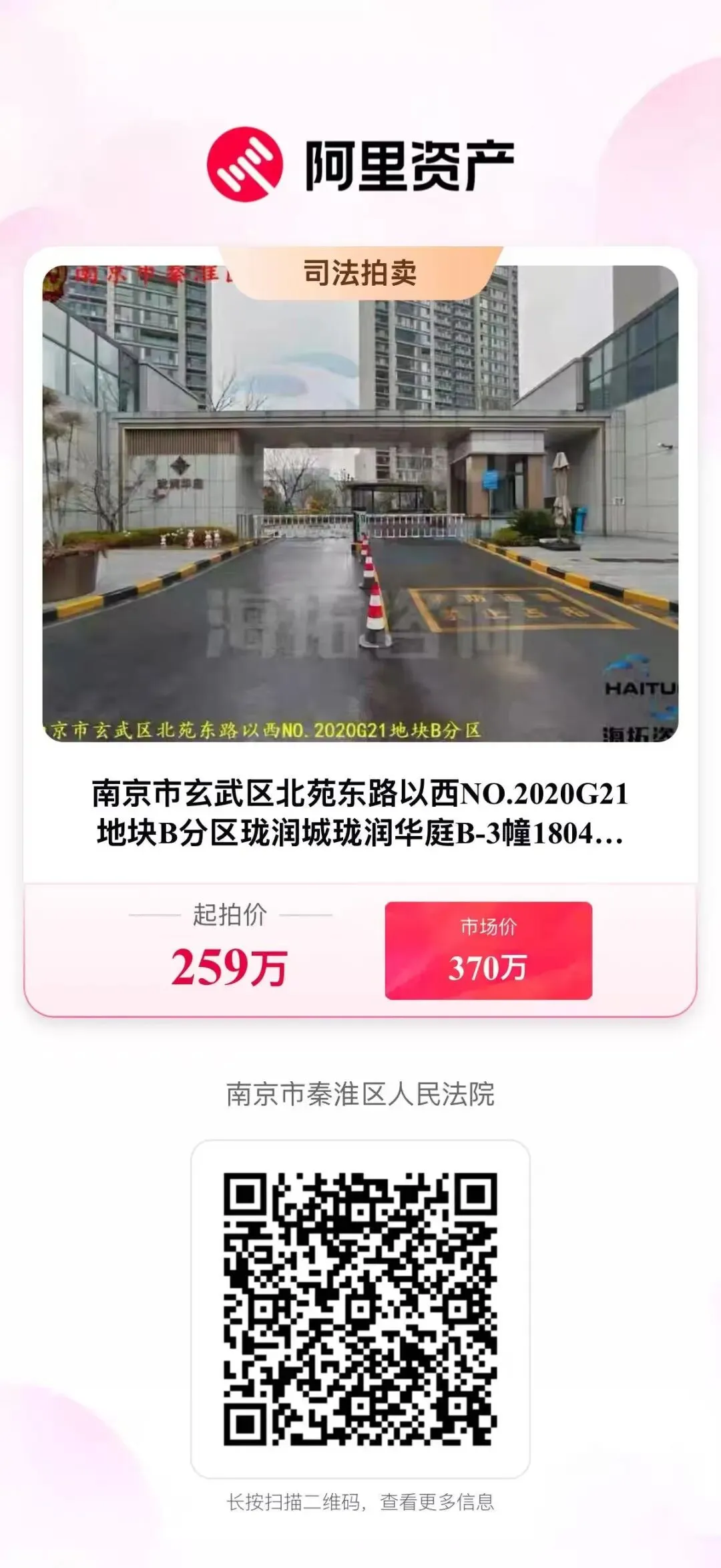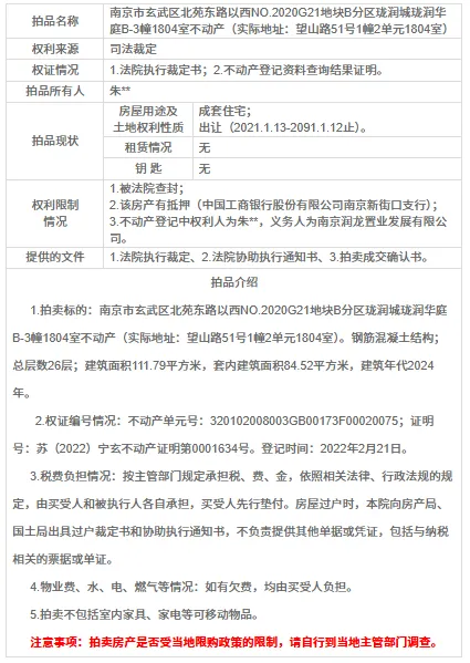 南京市玄武区北苑东路以西NO.2020G21地块B分区珑润城珑润华庭B-3幢1804室(实际地址:望山路51号1幢2单元1804室)房产-一拍