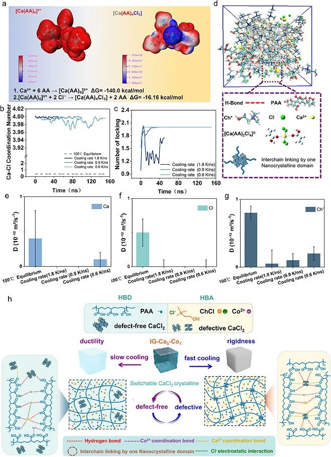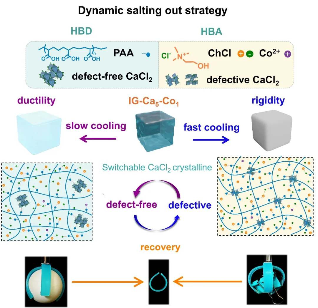 机械性能可编程凝胶在新型柔性电子设备开发中具有重要意义。近期,南京林业大学材料科学与工程学院陈敏智副教授、周晓燕教授团队设计了一种基于氯化胆碱和聚丙烯酸(ChCl - PAA)的机械可编程离子凝胶,其中氯化钙(CaCl₂)是关键的结构调节剂。通过动态可控的盐析策略,形成了一种晶体域锁定结构,从而提高了机械强度。冷却速率决定了最终的微观结构和机械性能。以每分钟- 20℃的速率快速冷却会产生大量有缺陷的CaCl₂晶格,这些晶格通过配位作用有效地诱导PAA链相互渗透,并形成局部的“晶体锁”,进而产生一个刚性网络(杨氏模量为448 ± 14.21 MPa)。相反,以每分钟 - 2℃的速率缓慢冷却会促进大尺寸、紧密堆积的CaCl₂晶体生长,减少聚合物- 晶体耦合,并产生相分离形态。因此,缓慢冷却的离子凝胶表现出显著较高的断裂伸长率(687 ± 18%)和明显降低的杨氏模量(11.6 ± 1.15 MPa)。总体而言,这种动态可控的盐析策略能够实现跨度达四个数量级的可逆分级模量调节,在可重新编程的自适应设备、湿度驱动的能量收集器、快速响应火灾报警器以及在刚性和延展性状态之间切换的双稳态传感器等方面具有广泛应用。这些发现为具有机械可编程强度、导电性和多功能刺激响应性的自适应聚合物 - 无机杂化系统提供了一种通用的设计策略。