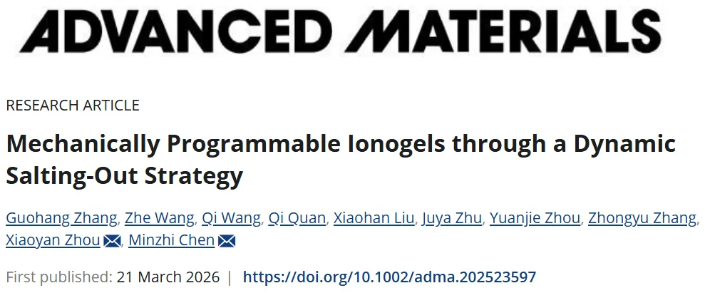 2026年3月21日,该工作以“Mechanically Programmable Ionogels through a Dynamic Salting-Out Strategy”为题发表在《Advanced Materials》上(Adv Mater 2026, e23597)。文章第一作者是南京林业大学硕士生张国航。该研究得到国家自然科学基金的支持。