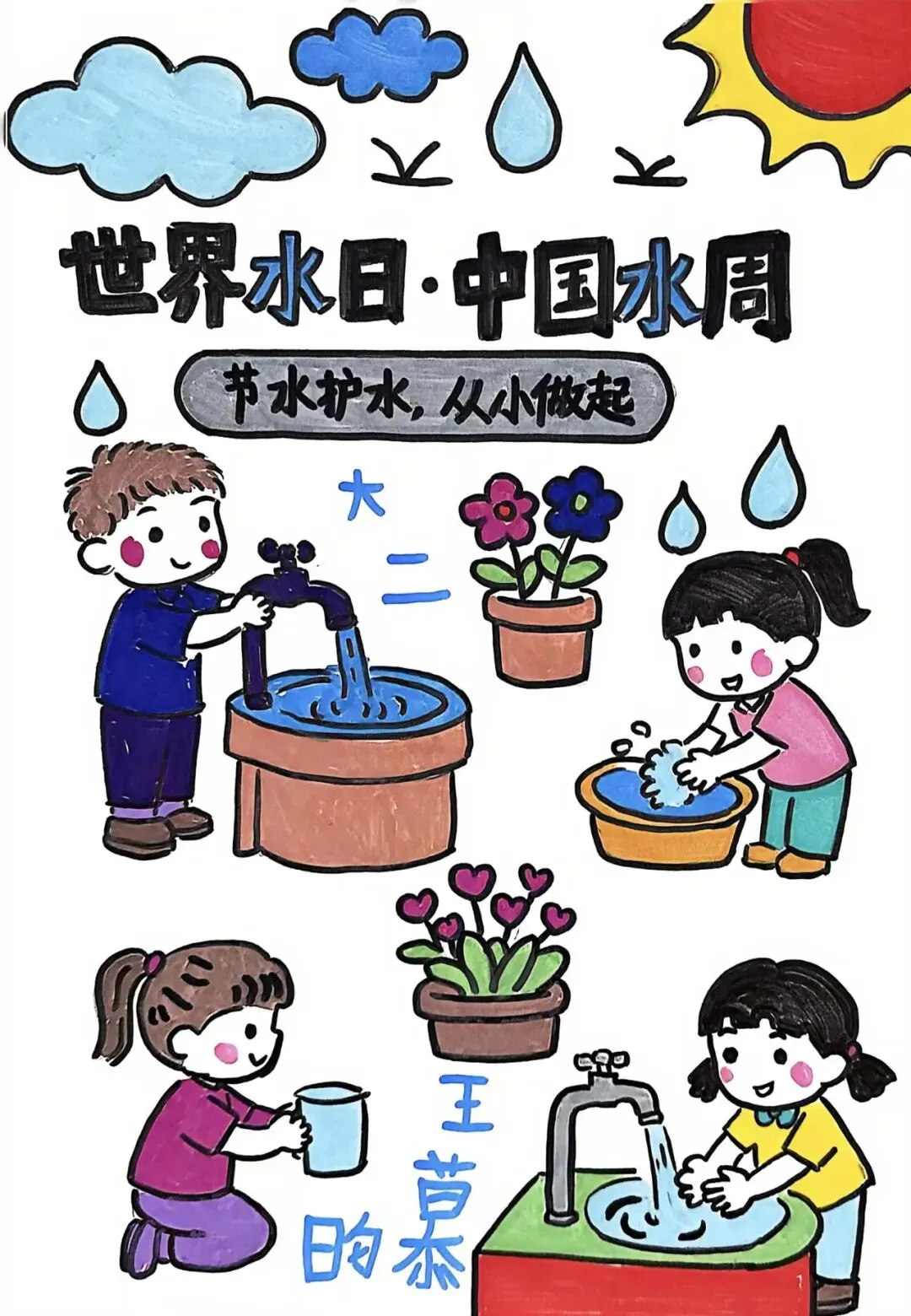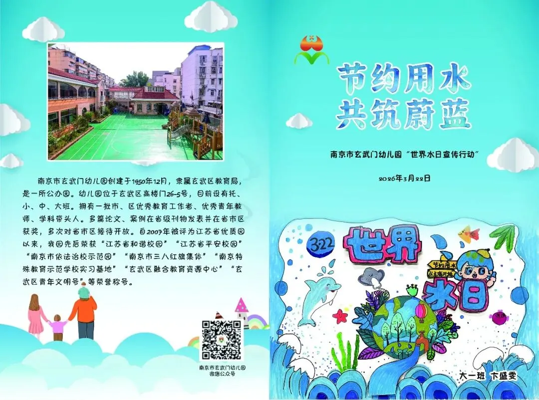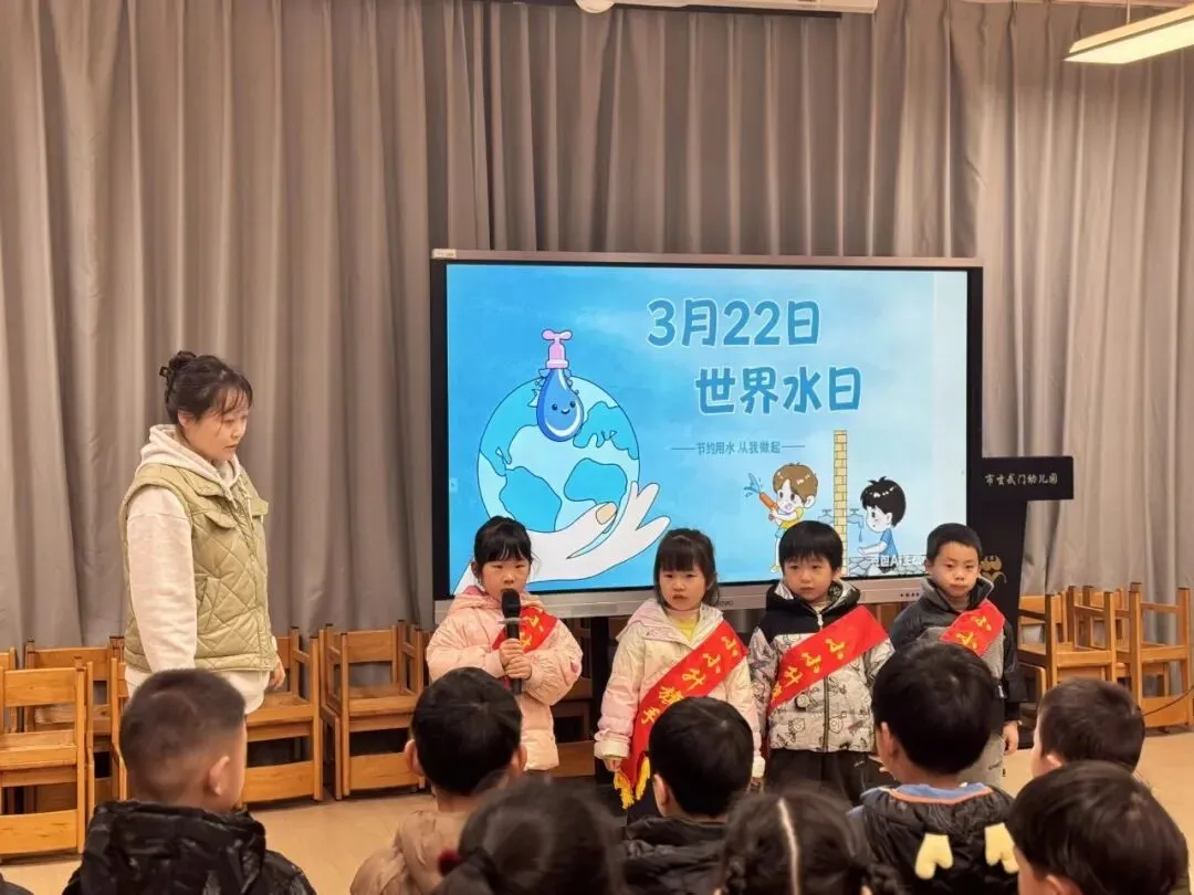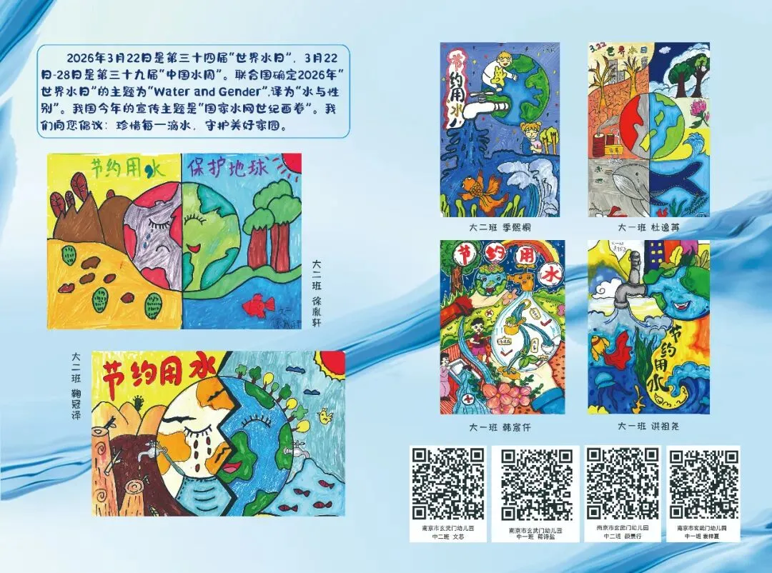 每年的3月22日为世界水日,旨在通过开展广泛的宣传教育活动,加强水资源保护,解决日益严峻的缺水问题。2026年“世界水日”主题为“Water and Gender”(译为“水与性别”)。2026年“中国水周”主题为“国家水网世纪画卷”。南京市玄武门幼儿园秉承回归儿童的理念,通过丰富有趣的世界水日专项活动,引导幼儿牢固树立珍惜水资源的理念,从小养成节约用水的好习惯。3月16日上午,中二班的小小升旗手通过主题晨会分享了自己在日常生活中的节水小妙招:随手关闭水龙头、用洗菜水淘米水浇花、少量多次饮用水等,用实际行动号召大家一起珍惜水、节约水、保护水,争当节水小卫士。小手护清水,童心爱地球。大班组的孩子们精心创作了节水宣传画。全园的小朋友和家长们积极参与投票,共同传递节约用水、爱护水资源的环保理念。为什么要节约用水呢?小班的小朋友们聆听了《大森林里的节水故事》。大家积极开动脑筋,热心帮助故事里的小鸭子想出了许多简单实用的节约用水好办法。