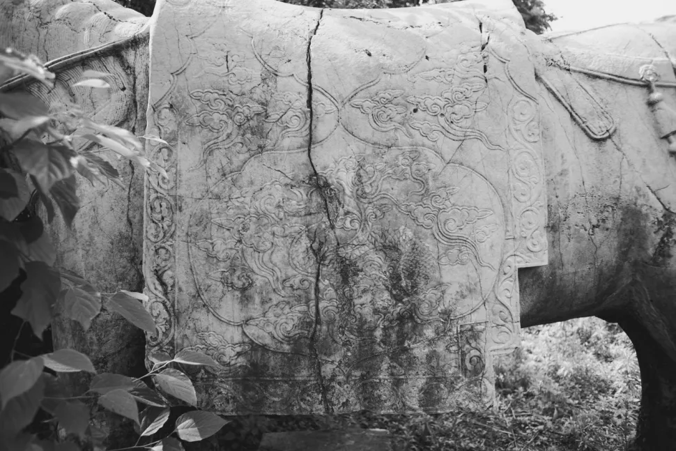 [29] 明孝陵的石马未配置控马官,马腹下四足间皆透空,算是个例外。但孝陵石马并无障泥与鞍辔,这也是与明初功臣墓石马全然不同之处。
