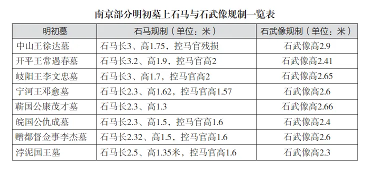 据上表所示,在特定的时空背景之下,墓主的位望与石像生的体量大小之间虽然也会受到偶然因素的影响,但大致都有其内在联系。揆诸此,再将吉山明代失考墓长3.2、高2.25米的石马与高达3米的石武像置身于明初的南京,怎么看都让人觉得无所适从。毕竟这两种石像生宛如“一骑绝尘”般超逾王公外戚诸墓的规制,委实令人感到不可思议,也与明初的时代背景不符,当然也意味着不可能是丰城侯李彬墓的遗存。