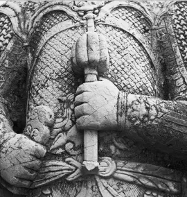 神道左侧石武像手执金瓜的造型