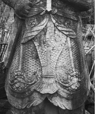 神道左侧石武像的鱼形裈甲与两侧膝裙上的锁子甲,锁子甲上刻画兽首皮带吊挂装置