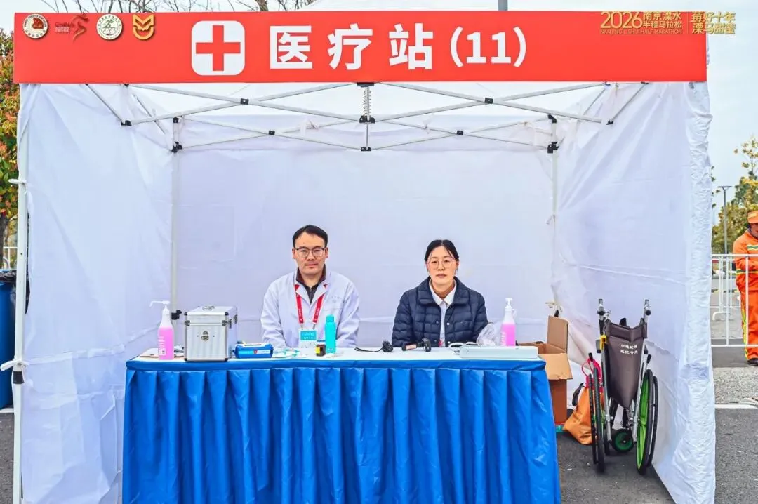 赛事的圆满成功,离不开全方位的专业保障体系。组委会以跑者安全为核心,围绕“3分钟急救响应”目标构建严密保障网络,精心规划医疗点布局,按每2.5公里间距布设医疗点并在赛道后半段强化布置,全赛道及起终点完赛区共设13个医疗点,如同安全堡垒覆盖赛事全程,确保跑者身体不适时第一时间获得专业救助。各医疗点配备AED、血压计、吸氧设备、急救箱等齐全急救设备及各类药品,可高效应对擦伤、扭伤、抽筋等常见运动损伤和中暑、低血糖等突发状况。同时,赛事配备47台移动AED,精准分布在赛道沿线、医疗点及10辆救护车内,织就全覆盖AED保障网;10辆救护车全程待命,搭载心电监护除颤仪等先进设备,经验丰富的医护人员随车值守,可快速开展急救、转运与后续救治。46名兼具跑步经验与专业医护技能的急救跑者,分散在各配速段人群中,实时关注跑者状态,对出现面色苍白、呼吸急促等异常的跑者第一时间开展现场处理,成为赛道上移动的“医疗卫士”。