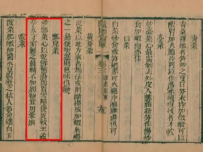 瓢儿菜:炒瓢菜心,以干鲜无汤为贵,雪压后更软。王孟亭太守家制之最精,不加另物,宜用荤油。瓢儿菜,即油塌菜,俗称“塌棵菜”。南京一带栽培多。