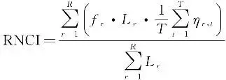 为评估关键道路的通勤效率,本文选取拥堵指数(road network congestion index,RNCI)作为评价指标。该指数根据道路速度性能指数和非拥堵时间比例计算,数值越低表示拥堵程度越高[31]。具体计算过程中,将通勤高峰期划分为T个等长时间间隔,逐一计算各时段的速度性能指数。当该指数小于或等于阈值η′时,判定该时间段内道路处于拥堵状态。最终,结合非拥堵时间比例和速度性能指数,并采用道路长度加权,得到关键通勤道路的RNCI,第r条道路的非拥堵时间比例fr、非拥堵时间间隔数τr,以及在时间间隔t的速度性能指数ηr,t