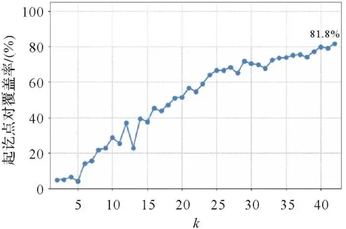 稳健性检验结果(图9)显示,在覆盖率大于等于80%的目标下,取42作为最优聚类数估计值。多次聚类的聚类中心分布图中,候选位置并非随机散布,而是明显形成若干簇,说明聚类中心具有稳定性。中心点形成的点云密度较高,表明其对数据扰动不敏感。尽管少数区域中点云分布相对稀疏,点位置存在轻微波动,但整体偏移幅度普遍较小。