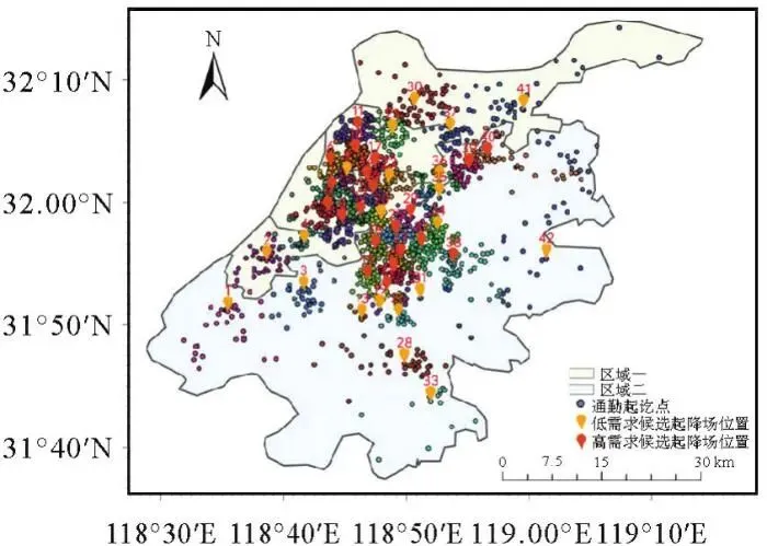 在原始的3201对通勤起讫点中,筛选出1718对出行距离大于10 km的长距离通勤起讫点进行聚类分析。结果表明,随着聚类数K的增加,聚类中心对起讫点的覆盖率持续提升,意味着站点能服务更多的长距离通勤需求(图7)。在覆盖率达到80%的条件下,共识别出42个聚类中心作为垂直起降场候选位置(图8)。这些聚类中心系通过聚类分析所得,仅用于后续布局优化的理论建模,不对应任何实际已建或规划中的起降场位置。其中,区域一分布20个,区域二分布22个,整体可实现81.8%的起讫点对覆盖率。