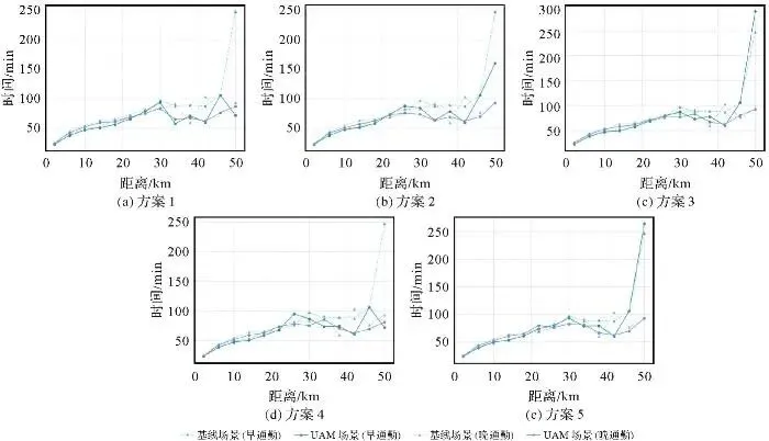 长距离通勤更能体现UAM的优势,而不同起降场布局方案对远距离通勤效率的提升效果存在差异(图12)。在所有方案中,UAM场景下的通勤时间整体低于基准场景,其中30~50 km区间内的差异最为显著。随着通勤距离的增加,基准场景下的通勤时间先逐渐上升,后于30 km处开始出现波动,这可能是因为部分长距离通勤者会选择城市快速路等高等级道路,其较高的通行速度在一定程度上抵消了距离增加带来的时间成本。由于UAM主要面向长距离通勤,其在30~45 km区间展现出明显的时间优势,通勤时间甚至低于部分中短距离出行。而在接近50 km的超长距离区间,通勤时间再次上升,原因可能在于起降场布局受限,未能有效覆盖少量超长距离通勤者的需求。此外,不同布局方案的通勤效率改善效果会随距离发生显著变化。在方案2、方案3和方案5的UAM场景中,约50 km的通勤距离对应的早通勤时间成本明显增加,而方案1和方案4则相对稳定。可能是因为后两种方案的布局在远距离连接方面形成了更高效的航线网络,能满足更多长距离通勤需求。