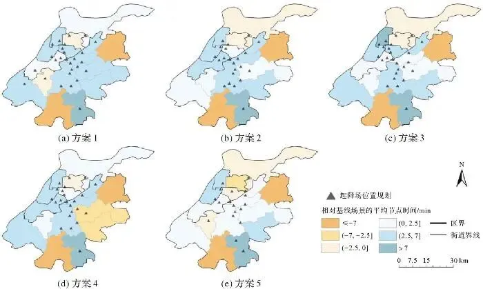 UAM的引入显著提升了长距离通勤效率,加强了区域之间的交通联系(图13)。从空间分布上看,起降场覆盖的区域普遍实现了较为明显的通勤时间缩减,时间节省的程度存在空间差异。地理位置相对偏远、远离通勤走廊中间地带的区域获得了更大的时间效率收益。说明UAM能有效克服长距离地面通勤的限制,提升边缘地区的可达性。这一趋势在所有选址方案中都保持一致,且江宁区最南部的街道始终表现出最多的时间节省。相反,一些缺少起降场布设的区域在引入UAM后出现了通勤时间增加的情况。其原因可能是部分起降场的接驳交通加剧了局部道路拥堵,并向周边扩散,而起讫点附近未接入UAM,仍依赖地面交通出行的通勤者在通勤途中遇到拥堵或绕行,导致时间延长。此外,局部区域的通勤时间变化对起降场布局结构高度敏感。如,方案3的布局使北部形成了更高效的空中走廊,显著优化了该方向的通勤效率;而在方案4中,东部区域出现了大范围的通勤时间增加,这表明该选址方案未能有效覆盖该区域的交通需求。