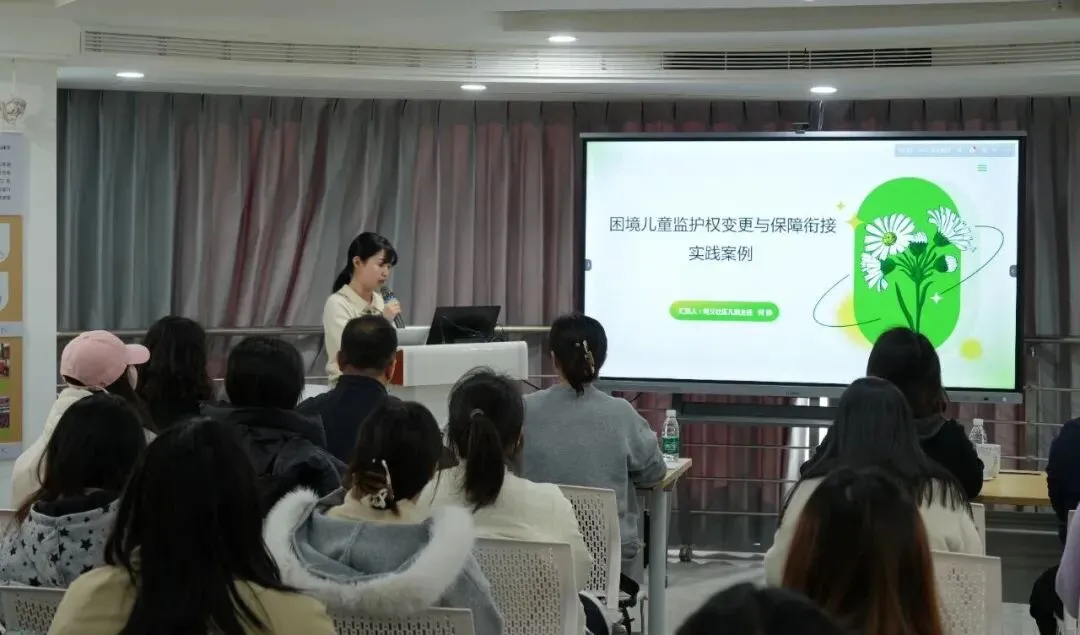 雨花台区西善桥街道明义社区儿童主任柯静围绕《从“监护失序”到“双维兜底”——困境儿童监护权变更与保障衔接实践》,分享困境儿童监护保障实操经验,为师生提供鲜活一线工作参考。