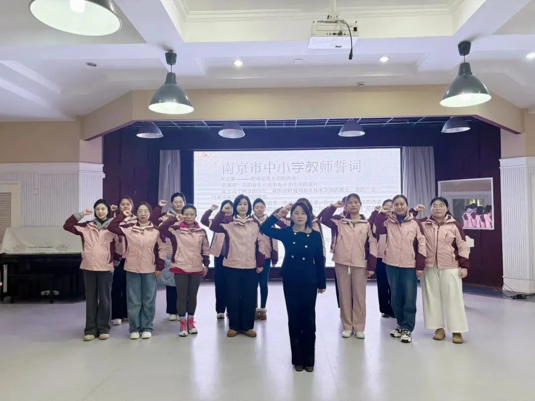 在执行园长任美蓉的带领下,全体教师肃立举拳,庄严宣读《南京市中小学教师誓词》。铿锵誓言,激励大家以德立身、以行立教,努力做有理想信念、有道德情操、有扎实学识、有仁爱之心的“四有”好教师。
