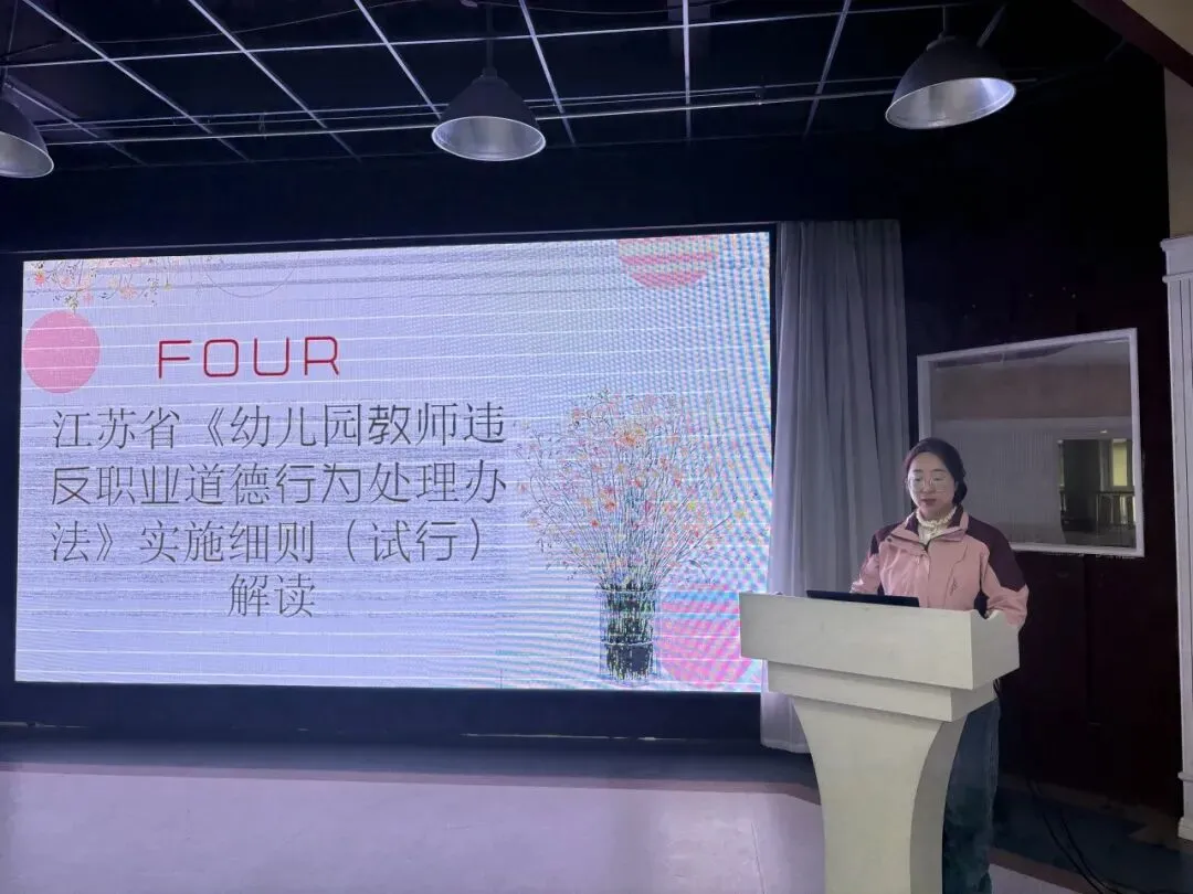 戴蓉老师带领大家学习《江苏省〈幼儿园教师违反职业道德行为处理办法〉实施细则(试行)》,细致讲解政策要点与核心条款,明确教师职业行为的“红线”与“底线”,引导大家规范从教、严守师德。