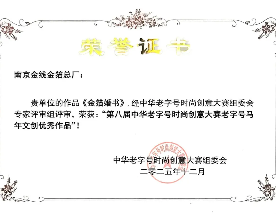 近日,第八届中华老字号时尚创意大赛评审结果正式揭晓。南京金线金箔总厂精心打造的文创作品《金箔婚书》,经大赛组委会专家评审组严格评审、层层遴选,凭借深厚的文化底蕴、精湛的非遗技艺与新颖的创意设计,成功斩获“第八届中华老字号时尚创意大赛老字号马年文创优秀作品”荣誉称号,为金线金箔总厂非遗创新发展再添光彩。